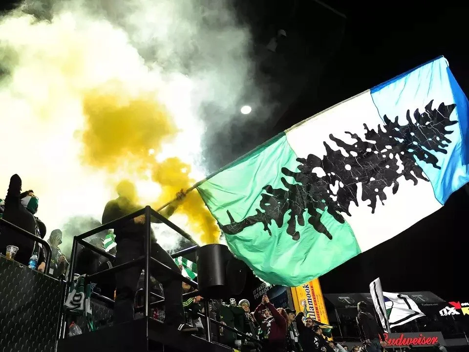 A Portland Timbers fan waves the Cascadia flag as he celebrates a second half goal during their MLS soccer game against the San Jose Earthquake on Tuesday, July 3, 2012, in Portland, Ore. Portland won 2-1. (AP Photo/Don Ryan)